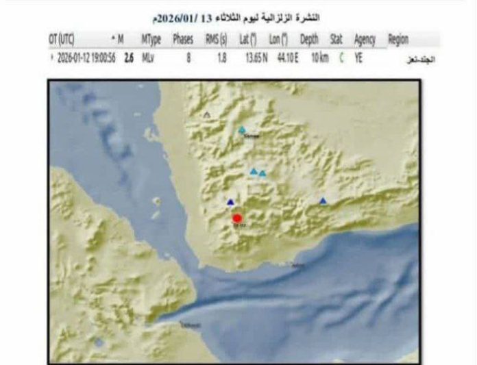 The head of the center, Engineer Mohammed Al-Houthi, told ‘Al-Thawra Net’ that the center recorded a light earthquake measuring 2.6 on the Richter scale in the Al-Jand area of Taiz.